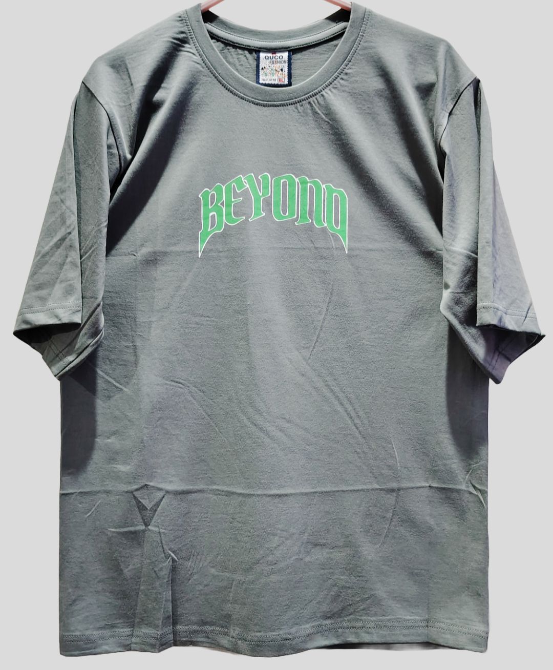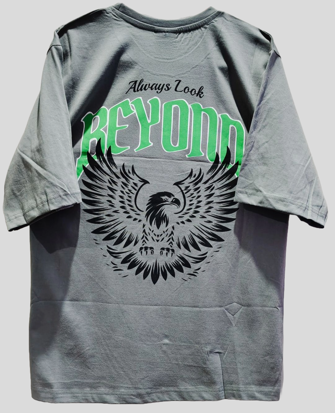 Make a bold statement with this steel grey oversized tee featuring a fierce black eagle graphic and the empowering message “Always Look Beyond.” The green-highlighted "BEYOND" text adds a pop of color and strength to the design, ideal for anyone who believes in rising above.