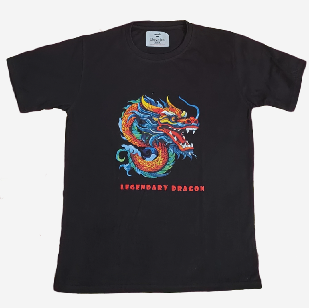 Unleash your inner legend with this stunning dragon graphic t-shirt. Featuring a vibrant, intricately designed Asian dragon in brilliant blue, orange, and red hues against a classic black backdrop. The dragon's scales and flowing form are rendered in exceptional detail, with